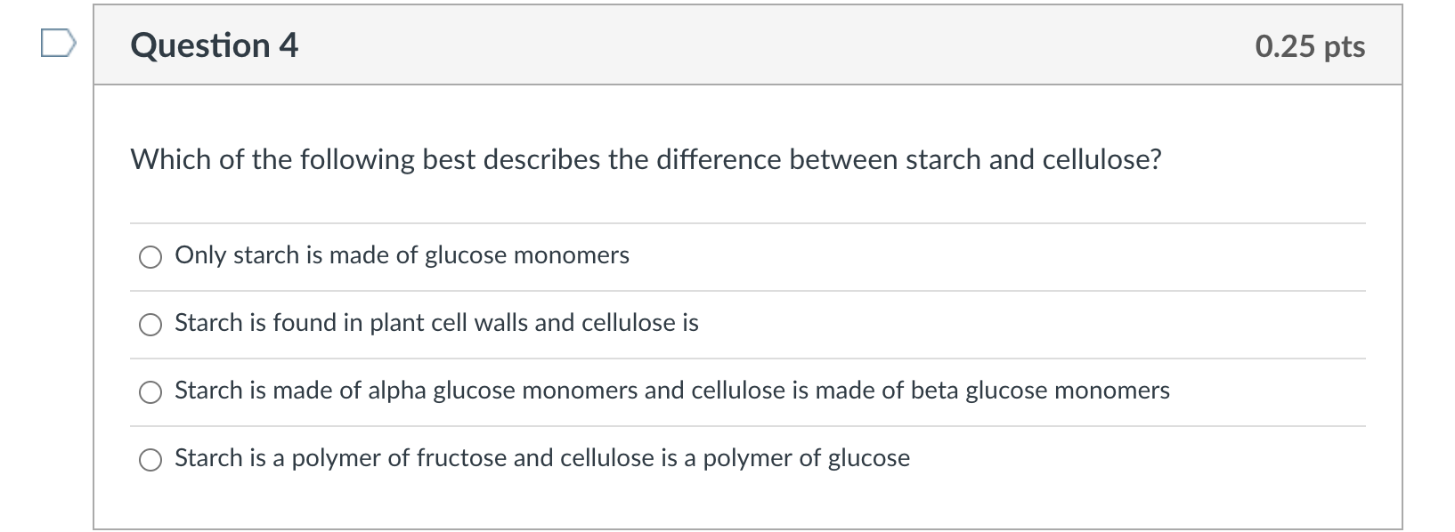 Solved Which Of The Following Best Describes The Difference Between Starch And Cellulose Only Starch Is Made Of Glucose Moromers Starch Is Found In Plant Cell Walls And Cellulose Is Starch Is Made